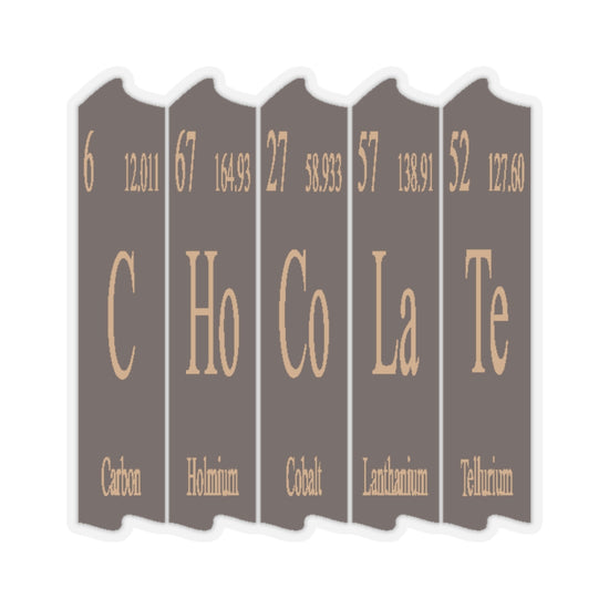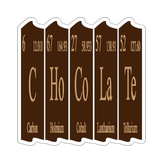 Stylish chocolate periodic table element stickers perfect for decorating laptops, journals, and windows. Gives a fun and nerdy vibe, suitable for science enthusiasts and students. Ideal for Valentine's Day, National Chocolate Day, or any occasion.