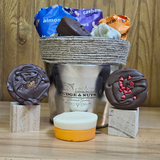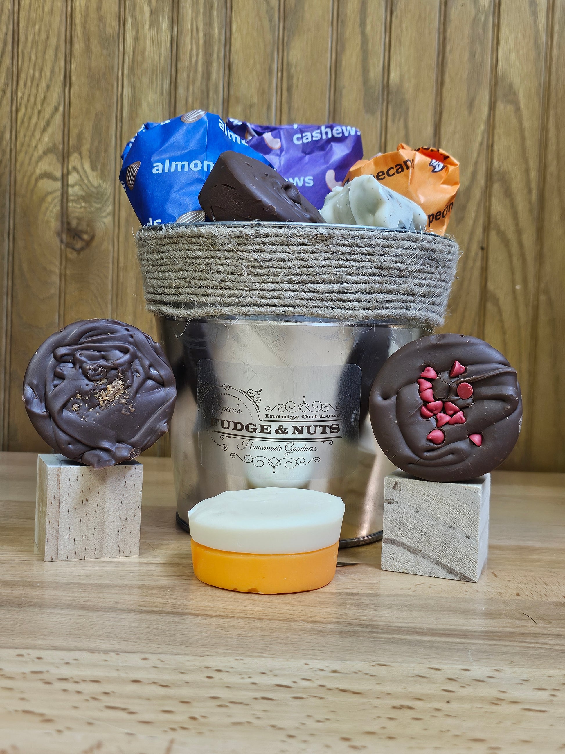 Send the power of sweet and savory with this tasty tin of our top 5 best-selling fudge cups combined with 3 cones of roasted nuts. Your special someone will enjoy at least 15 oz of rich, fudgy goodness made with real cream, butter, and just the right amount of sweetness balanced with the finest pecans, cashews, and almonds slow roasted with cinnamon and sugar to create a forever memorable treat. In addition to the roasted nuts, we'll pack our signature tin with kettle-fresh fudge cups in these fan favorite flavors: chocolate, peanut butter, pistachio, raspberry chocolate, and chocolate walnut. The perfect gift for your special someone!
