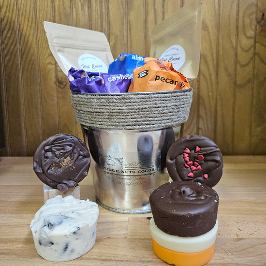 When words are just not enough, this gift tin is the answer. Overflowing with decadent fudge, savory roasted nuts and rich hot cocoa, let tantalizing goodness do the talking for you! This tin features our top 7 best-selling fudge cups combined with 3 cones of roasted nuts and 3 flavors of hot cocoa. Your special someone will enjoy at least 22 oz of rich, fudgy goodness made with real cream, butter, and just the right amount of sweetness balanced with the finest pecans, cashews, and almonds slow roasted with cinnamon and sugar to create a forever memorable treat. In addition to the roasted nuts, we'll pack our signature tin with kettle-fresh fudge cups in these fan favorite flavors: chocolate, peanut butter, pistachio, raspberry chocolate, chocolate walnut, maple, and chocolate marshmallow. The perfect gift for your special someone!