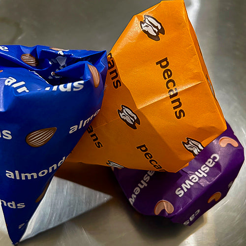 This combo pack comes with one cone of roasted cashews, one cone of roasted almonds, and one cone of roasted pecans. Together, your combo will be packed with at least 9 oz. of nuts that have been slow roasted and glazed with cinnamon and sugar.